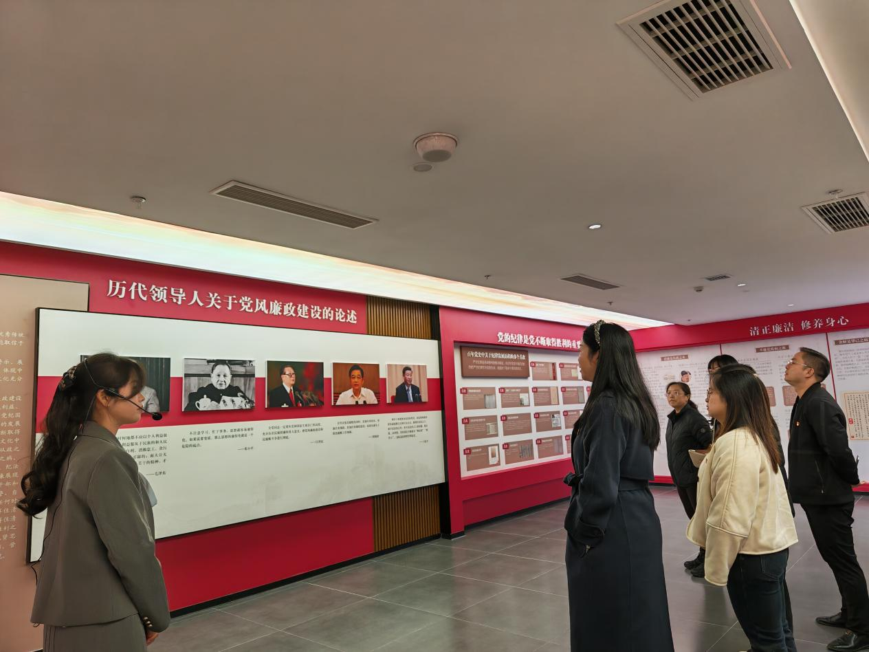 随后,众人前往校史馆内新建成的廉洁文化教育基地。该基地融教育、警示、展示、体验于一体,突出清廉主题与中医特色,展区四部分内容(含党领导人廉政论述、党史纪律发展、传统清廉故事与警示案例、“国医践廉”名医事迹)引人深思。参观中,梁明珠书记带领全体党员重温入党誓词,回望初心、承诺廉洁,坚定拒腐信念。