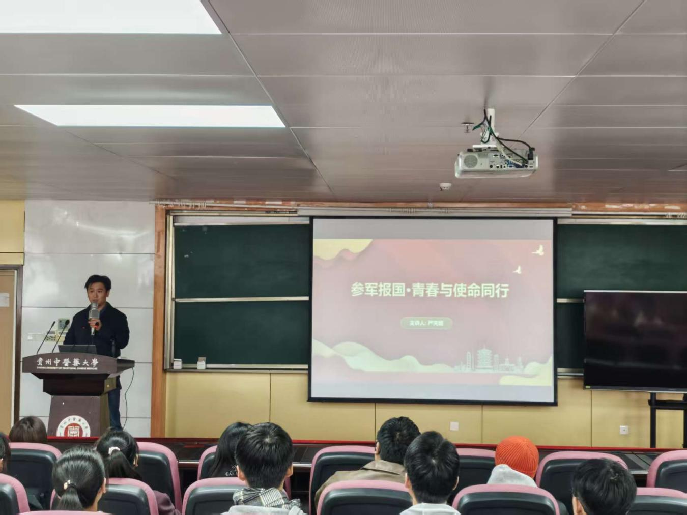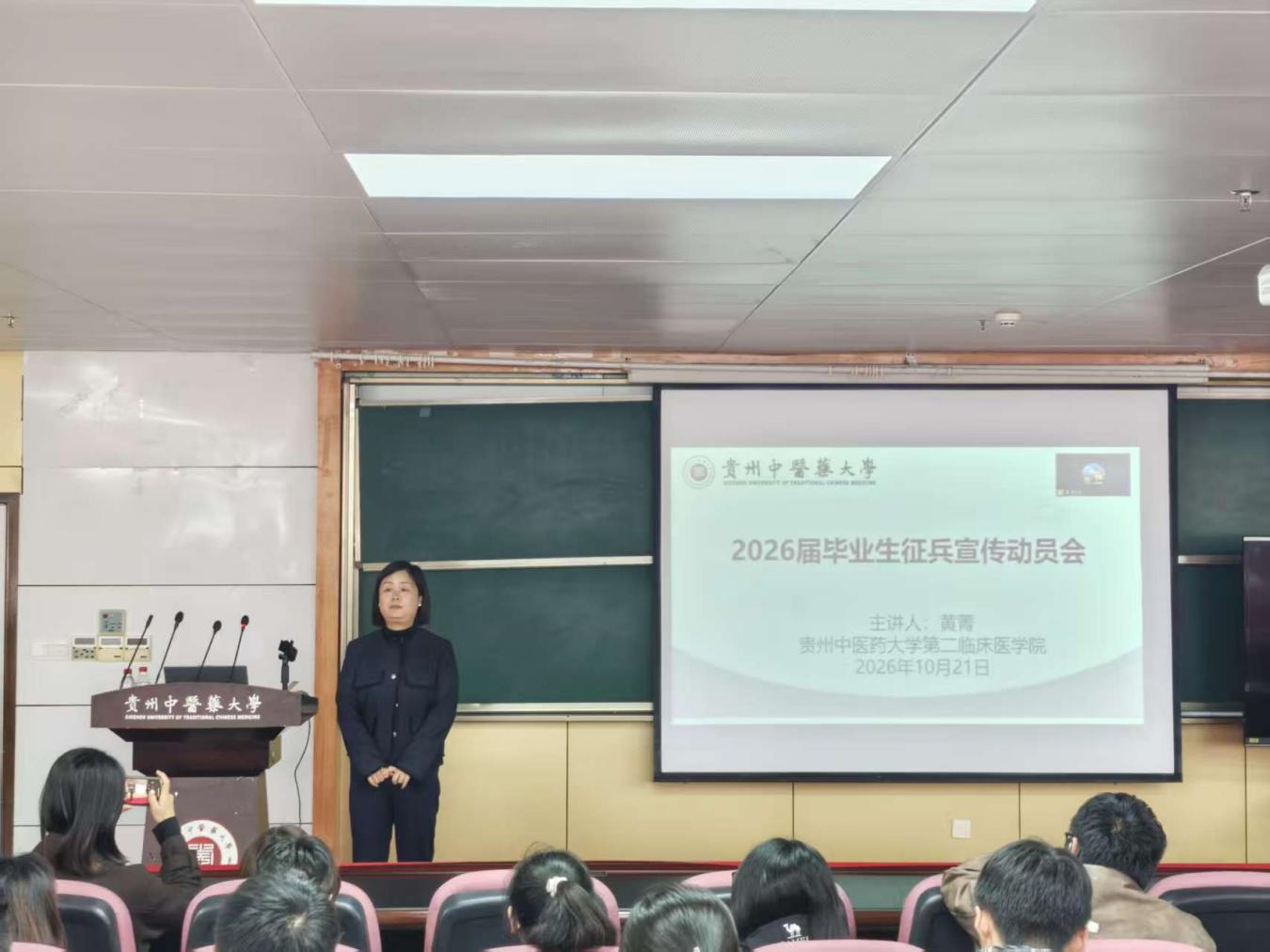 10月21日,贵州中医药大学学生工作部(武装部)到第二临床医学院为毕业班同学开展“参军入伍·青春与使命同行”的大学生入伍政策宣讲会。本次宣讲会由第二临床医学院筹备并邀请武装部老师到甲秀校区开展,旨在深入贯彻国家征兵政策,激发学子爱国热情,为国防事业输送高素质人才。